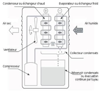 Le déshumidificateur DY est composé de différents éléments internes, dans lesquels circule un fluide frigorigène sous différentes formes permettant de diminuer l’humidité de l’air. L’air humide, préalablement filtré, est refroidi au contact de l’évaporateur ce qui engendre une condensation et un abaissement de l’humidité. L’air est ensuite réchauffé au contact du condenseur, ce qui permet de diminuer la température du fluide frigorigène. Un ventilateur anime le flux d’air dans le circuit. Le cycle se renouvelle jusqu’à ce que l’humidité atteigne la valeur de consigne.